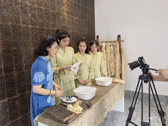 趙愛新(左一)帶領(lǐng)學(xué)生在羊樓洞古鎮(zhèn)現(xiàn)場(chǎng)制作茶染作品。通訊員 供圖