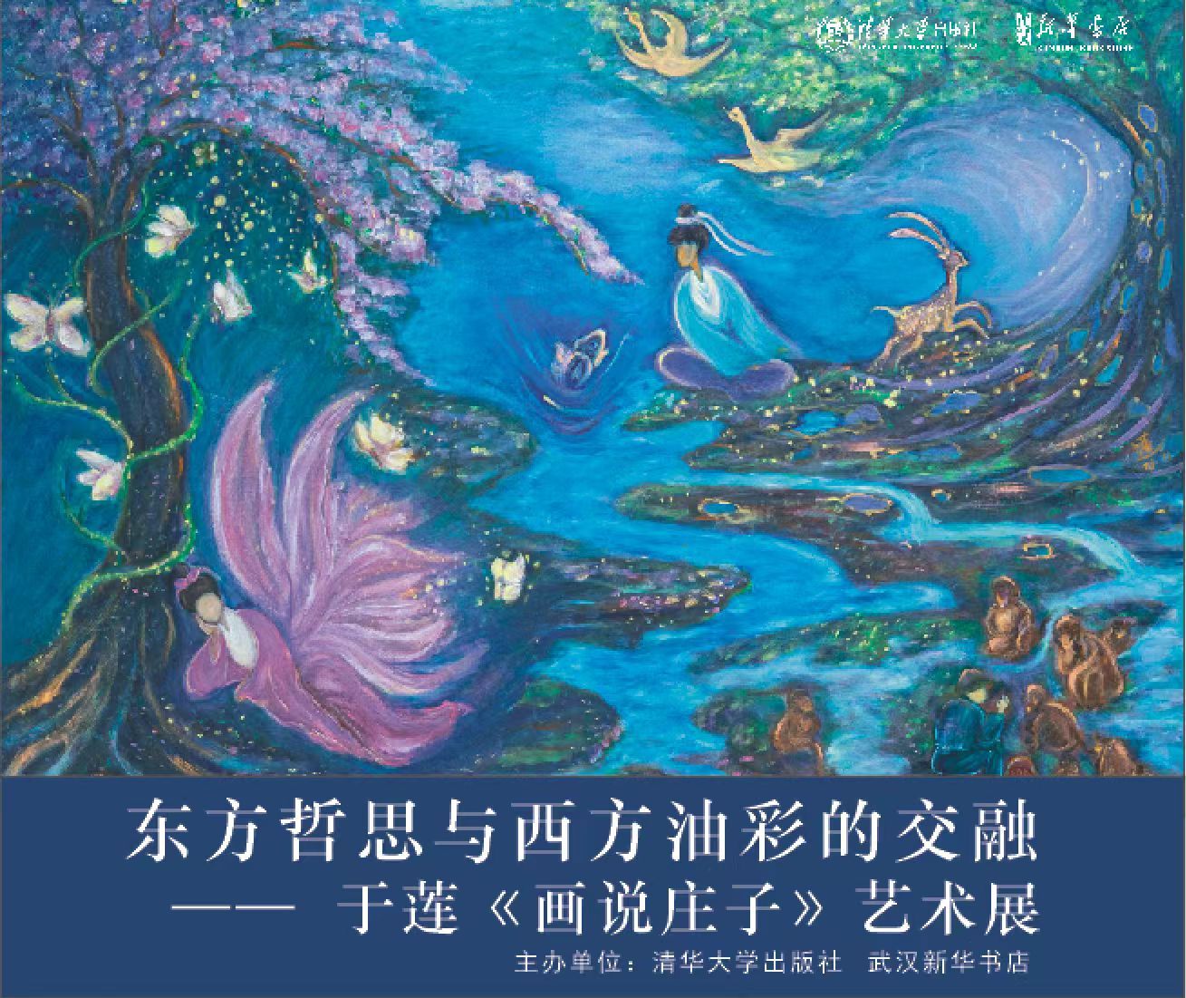 清華大學出版社特邀當代藝術家于蓮,耗時三年創(chuàng)作 27幅莊子主題油畫,以中西合璧的筆觸詮釋“天人合一”哲學。巨幅三聯(lián)畫《鯤鵬之變》用漸變的藍紫色調(diào)展現(xiàn)莊子的宏大宇宙觀,四聯(lián)畫《至樂》則以明麗色彩解構(gòu)生死命題。