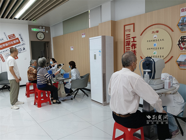 活動(dòng)當(dāng)天,社區(qū)黨群服務(wù)中心設(shè)立了臨時(shí)義診服務(wù)點(diǎn)。武漢大學(xué)人民醫(yī)院眼科醫(yī)護(hù)團(tuán)隊(duì)為居民提供了包括視力檢查、眼壓測(cè)量、??漆t(yī)生問診等一系列專業(yè)診療服務(wù)。社區(qū)基層黨員和志愿者積極配合,有序引導(dǎo)居民排隊(duì)、協(xié)助信息登記、耐心解答疑問,保障了現(xiàn)場(chǎng)流程順暢、秩序井然。