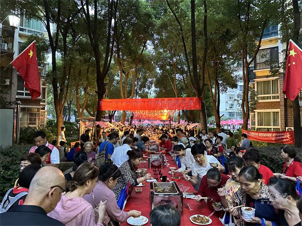 活動中,文藝表演與互動環(huán)節(jié)穿插進(jìn)行,帥鼓《歌唱祖國》、民樂《地道戰(zhàn)》、黃梅戲《再唱山歌給黨聽》輪番上演。當(dāng)54平方米的巨幅國旗緩緩展開,居民們揮舞小國旗齊唱贊歌,手中的紙飛機(jī)帶著美好祝愿飛向夜空,電子煙花綻放的瞬間,現(xiàn)場氣氛達(dá)到高潮。此外,三輪抽獎(jiǎng)、“最受歡迎菜品”評選等環(huán)節(jié),更讓活動充滿驚喜與趣味。
