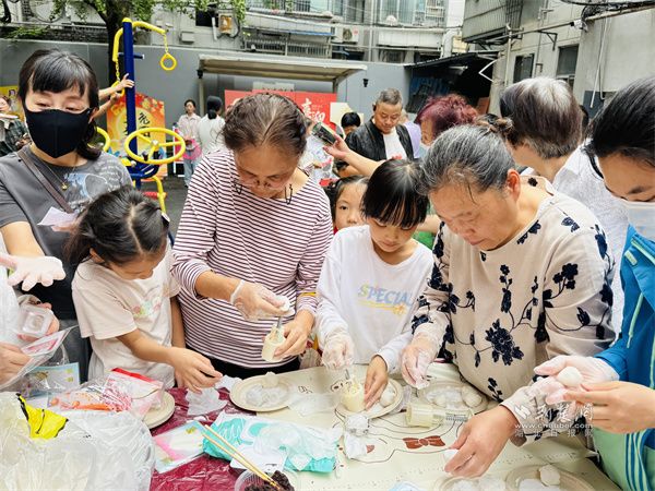 活動現(xiàn)場,各區(qū)域精彩紛呈。“巧手做月餅”最是熱鬧,家庭成員圍在桌前,揉面、包餡、壓模默契配合,一個個晶瑩的冰皮月餅新鮮出爐;銀杏樹上掛著百余條燈謎,“舉頭望明月(打一中藥名)”“中秋菊盛開(打一成語)”引得居民駐足思索,不時有人喊出答案,歡呼聲此起彼伏。小朋友們也有專屬樂趣,“月滿花環(huán)”區(qū)里,用仿真花材編出中秋裝飾;“玉兔拔蘿卜”游戲中,你追我趕比拼速度,歡笑聲此起彼伏。