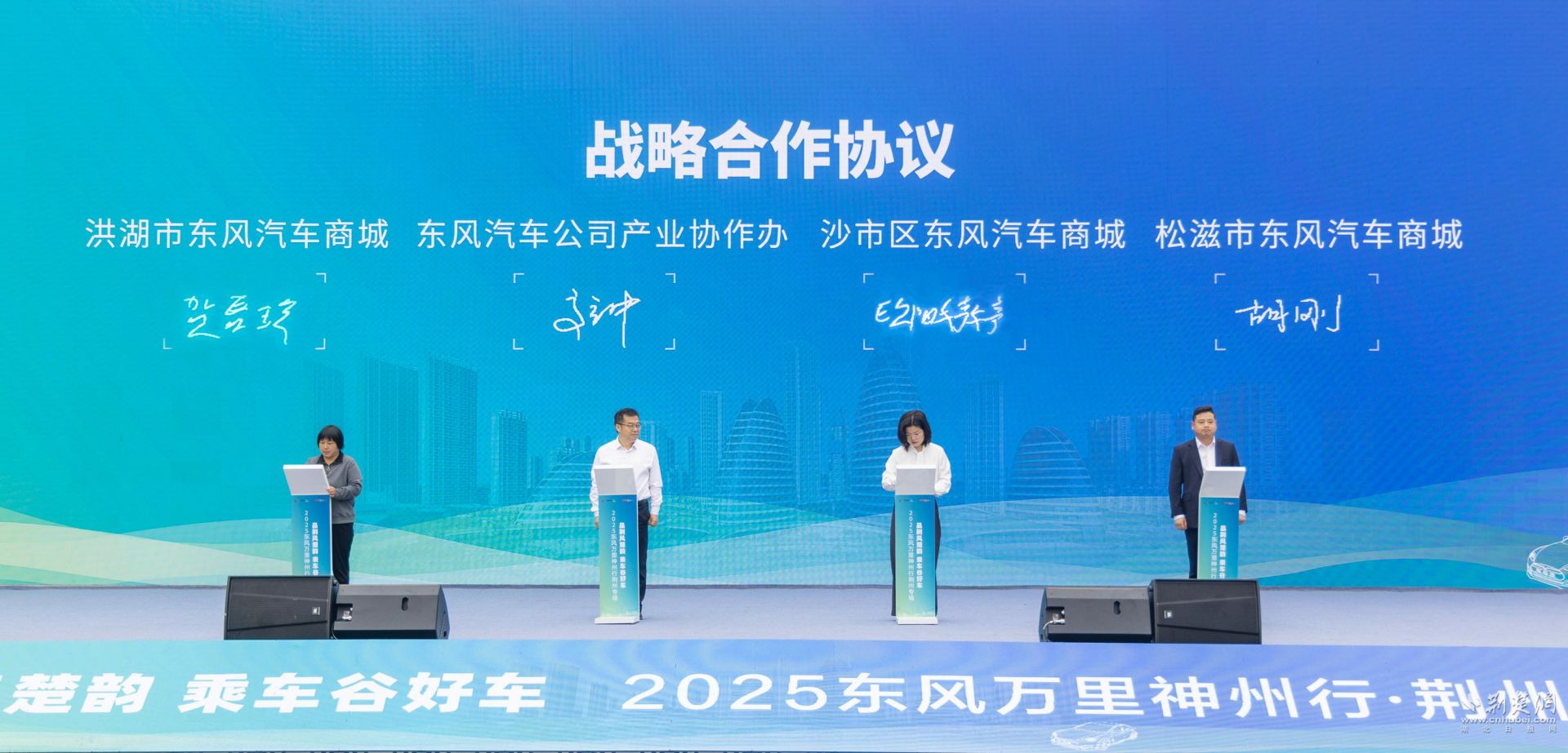 活動現(xiàn)場,神龍汽車與荊州市當(dāng)?shù)?家駕校簽訂100臺駕考駕培車購車協(xié)議,東風(fēng)汽車公司產(chǎn)業(yè)協(xié)作辦公室與荊州市機關(guān)事務(wù)服務(wù)中心簽訂戰(zhàn)略合作協(xié)議,東風(fēng)汽車公司產(chǎn)業(yè)協(xié)作辦公室與荊州市沙市區(qū)、洪湖市、松滋市三家東風(fēng)汽車商城簽訂戰(zhàn)略合作協(xié)議。