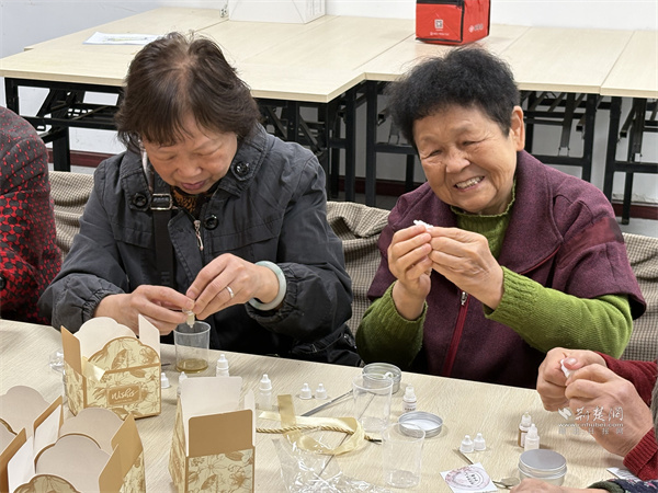 在大歌笛湖小區(qū)鄰里客廳內(nèi)熱鬧非凡,水拓扎染絲巾的制作現(xiàn)場,老人們按照工作人員講解的步驟興致勃勃地動(dòng)手實(shí)踐,讓一幅幅色彩斑斕、花紋各異的絲巾作品逐漸成型,老人們拿著自己親手制作的絲巾,成就感滿滿。天然蜂蠟護(hù)手霜DIY環(huán)節(jié),大家按照配比將蜂蠟、橄欖油等材料混合加熱、攪拌、裝罐,制作出天然無添加的護(hù)手霜,既實(shí)用又健康。鄰里客廳外的便民服務(wù)也同步貼心上線,免費(fèi)理發(fā)、血壓測量、法律咨詢等服務(wù),切實(shí)幫助老年人解決實(shí)際需求,讓“笛韻”成為串聯(lián)健康、睦鄰、便利生活的“銀齡生活協(xié)奏曲”,串聯(lián)起銀齡幸福生活。