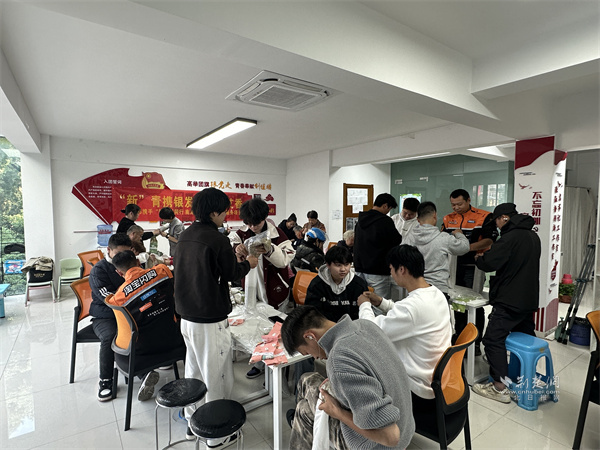 現(xiàn)場采用“1+1”結(jié)對模式,即1名新就業(yè)群體成員與1名老年人協(xié)作。年輕人負(fù)責(zé)填充艾草,老年人則憑豐富的生活經(jīng)驗(yàn),指導(dǎo)填充節(jié)奏和套枕套的技巧,兩代人配合默契?!捌綍r(shí)送餐趕時(shí)間,很少和社區(qū)老人聊上幾句,今天才發(fā)現(xiàn)他們懂這么多生活技巧,太厲害!” 一位外賣騎手一邊小心將艾草填入枕套,一邊笑著感慨,身旁的老人則熟練幫他封口打結(jié)。