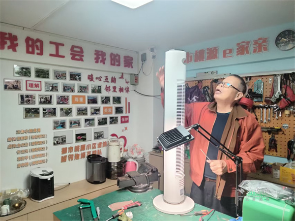 這個(gè)充滿煙火氣的共享工具空間,位于社區(qū)17棟架空層。雖面積不大,卻五臟俱全,墻上整齊擺放著螺絲刀、萬用表、扳手、電鉆等各類工具,操作臺(tái)上堆滿居民送來的待修物品。來自小區(qū)的退休工程師志愿者分工明確,有的排查小家電故障,有的調(diào)試自行車零件,耐心傾聽需求、細(xì)致檢查物品,用專業(yè)素養(yǎng)贏得居民信賴。