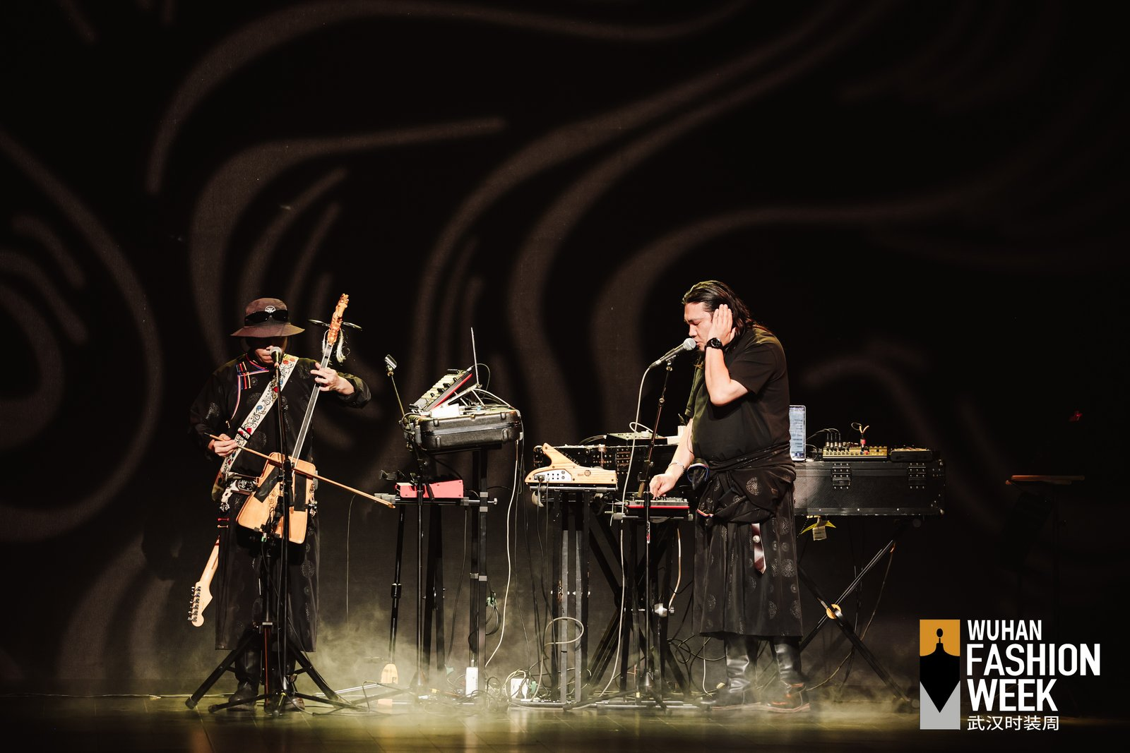 陳宇攜手Taiga樂隊(duì),把錫林郭勒草原的晨霧、馬頭琴與電子節(jié)拍轉(zhuǎn)化成可行走的時(shí)裝音景??沙掷m(xù)植物素皮、流蘇與繩結(jié)形成呼應(yīng),讓游牧精神在當(dāng)代廓形中保持自由。