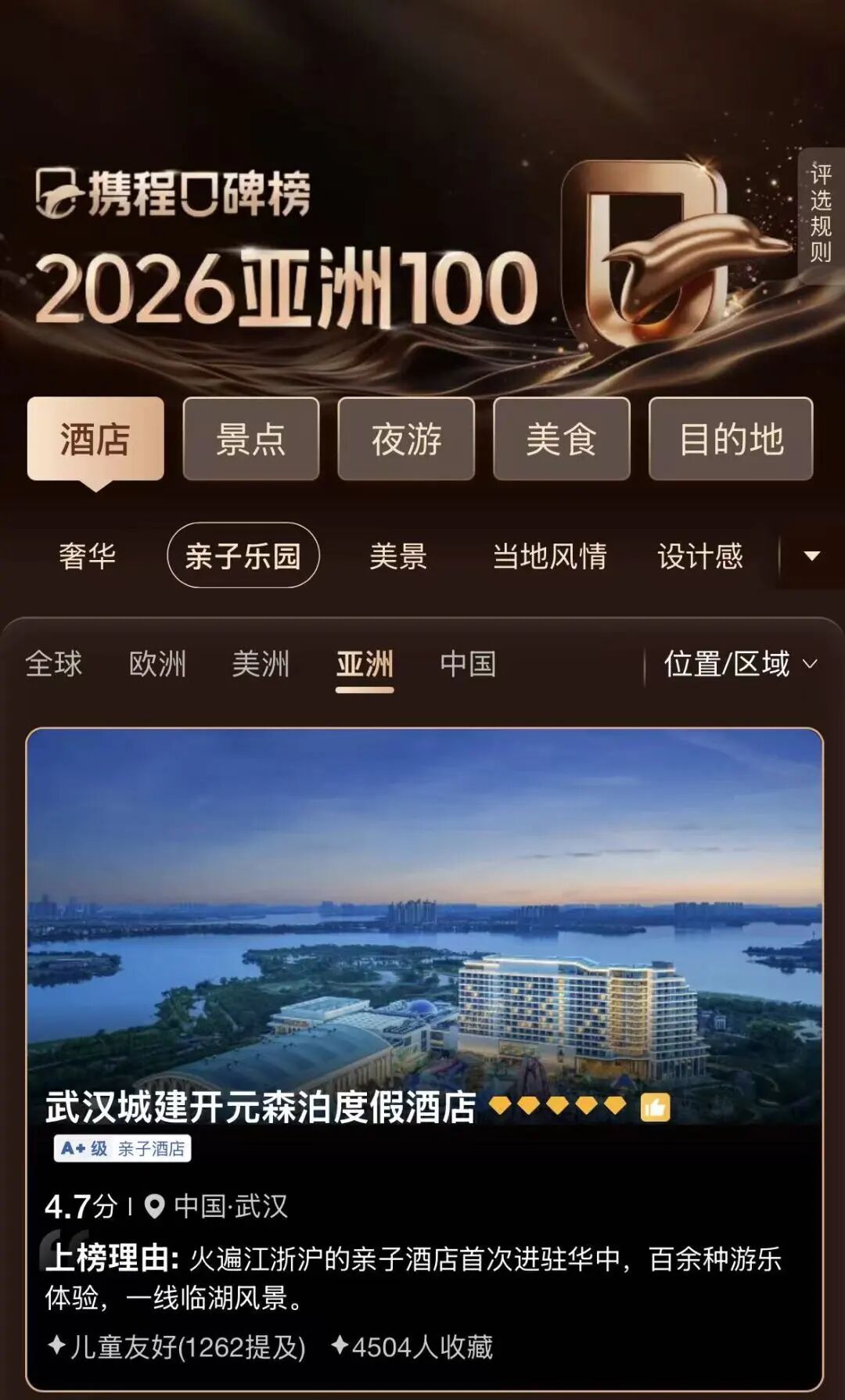 近日,攜程平臺(tái)發(fā)布《攜程口碑榜2026年度榜單》,武漢城建開元森泊度假酒店成功上榜亞洲親子樂園酒店百強(qiáng),位列亞洲第58位、國內(nèi)第29位,成為湖北省唯一上榜的酒店。