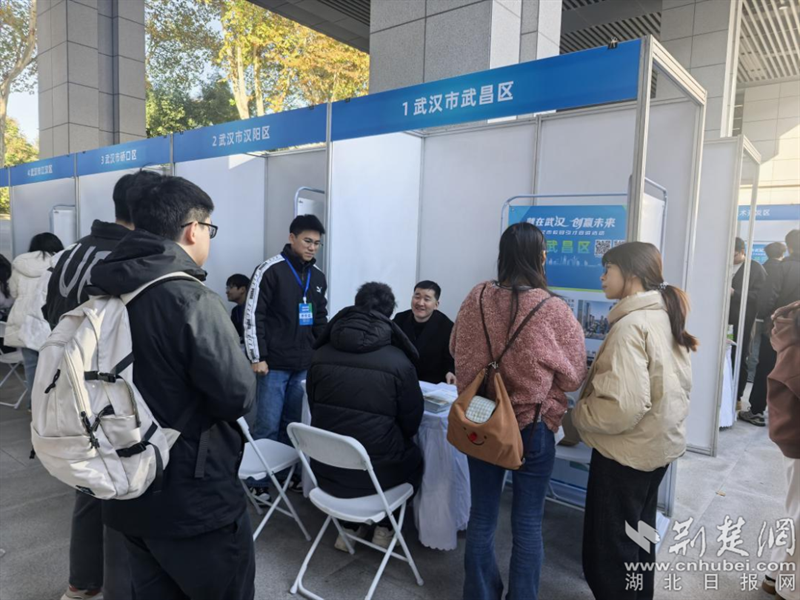 應(yīng)屆畢業(yè)學(xué)子在武昌區(qū)展臺前了解咨詢政策。
