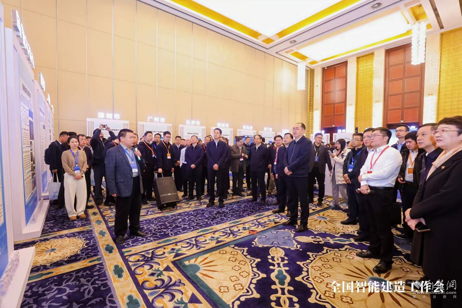 會(huì)前,與會(huì)代表集中觀摩了全國(guó)智能建造試點(diǎn)城市成果展。在參觀武漢市智能建造三年成果展板時(shí),住房城鄉(xiāng)建設(shè)部副部長(zhǎng)李曉龍認(rèn)真聽取了武漢市關(guān)于“科技+產(chǎn)業(yè)+人才”一體化發(fā)展新模式及智能建造新生態(tài)建設(shè)情況的匯報(bào),對(duì)武漢在推動(dòng)建筑業(yè)轉(zhuǎn)型升級(jí)方面的實(shí)踐成效給予了充分肯定。