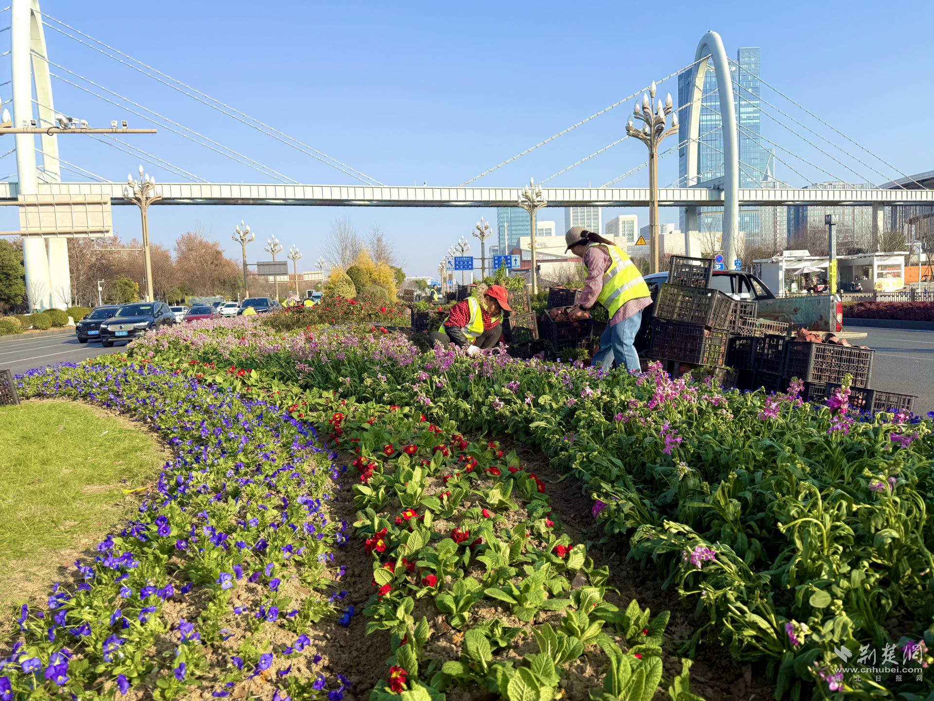 在城市主干道和重要節(jié)點(diǎn),節(jié)日花卉景觀已陸續(xù)亮相。高新大道、光谷廣場等核心路段,約7300平方米的三色堇、角堇、石竹等時(shí)令花卉集中綻放,色彩層次分明,形成綿延不斷的“城市花帶”。在光谷同濟(jì)醫(yī)院周邊、光谷一路等區(qū)域,600平方米的精致花境點(diǎn)綴街角,與城市空間自然融合,為市民日常出行增添亮色。