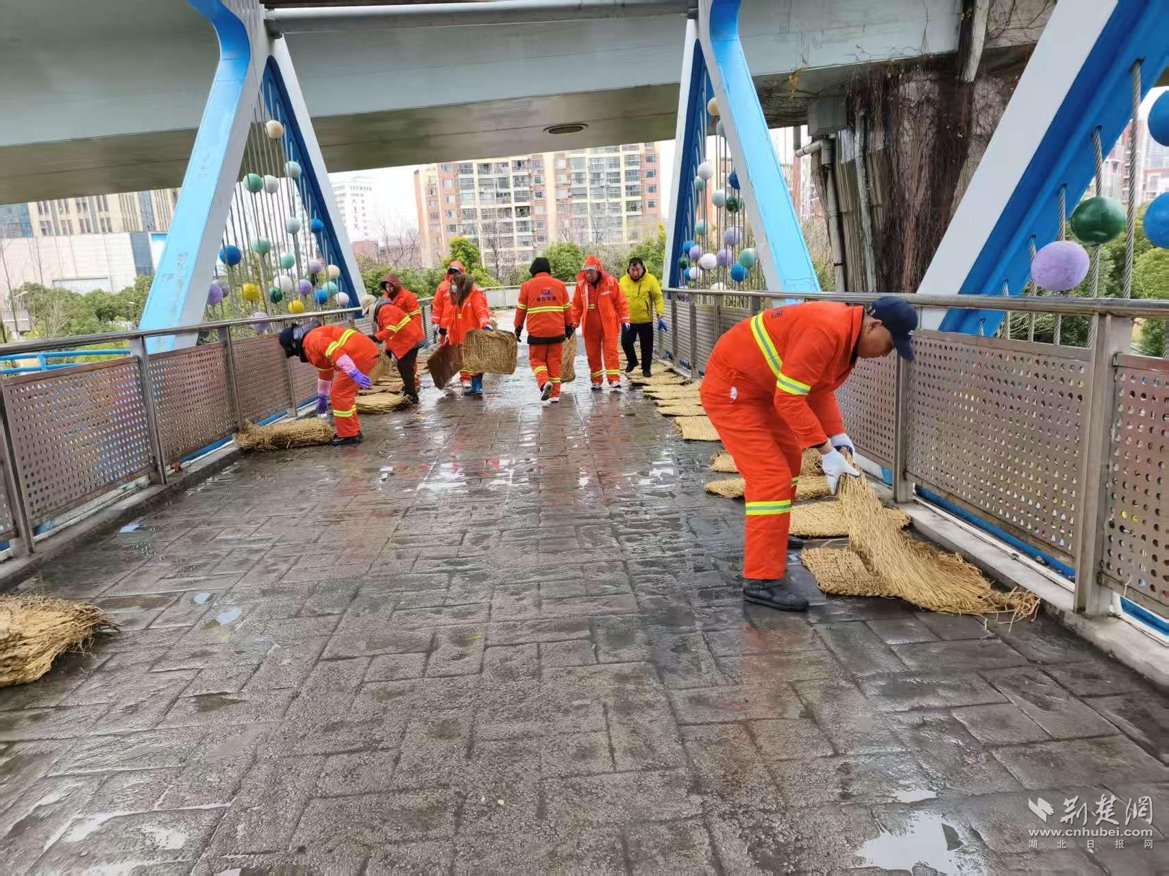 防滑措施同樣向行人集中區(qū)域延伸。19日17時(shí)起,吳家山環(huán)山路人行天橋上,環(huán)衛(wèi)工人與執(zhí)法隊(duì)員開(kāi)始鋪設(shè)防滑草墊?!皹騼蓚?cè)是學(xué)校,晚高峰和早高峰人流集中,提前鋪設(shè)能減少滑倒風(fēng)險(xiǎn)?!眳羌疑浇志C合執(zhí)法中心副主任陳偉說(shuō)。
