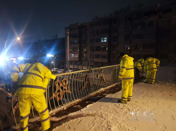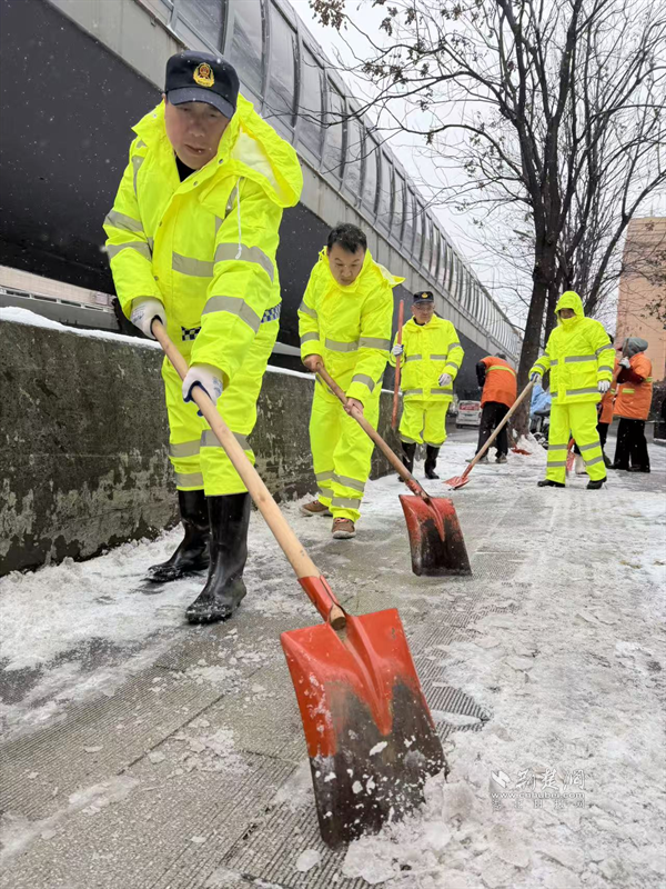 1月19日深夜至20日凌晨,隨著雪勢加大,街道應(yīng)急搶險隊伍迅速化身“風(fēng)雪夜行人”,頂著嚴(yán)寒奔赴一線。他們采取機(jī)械作業(yè)與人工作業(yè)相結(jié)合的方式,對轄區(qū)主次干道、橋梁、陡坡、十字路口等重點路段和易結(jié)冰區(qū)域,進(jìn)行循環(huán)撒布融雪鹽和清掃作業(yè),最大限度預(yù)防道路結(jié)冰。寒夜中,隊員們衣衫被雪花浸濕,臉頰被寒風(fēng)凍紅,但無人退縮,持續(xù)堅守。天色微明,雪勢稍歇,隊伍立即轉(zhuǎn)戰(zhàn),對背街小巷、人行道、天橋等區(qū)域的殘留積雪進(jìn)行清理,并在坡道、臺階等易滑處鋪設(shè)防滑草墊、設(shè)置警示標(biāo)識,全力保障早高峰出行安全順暢。