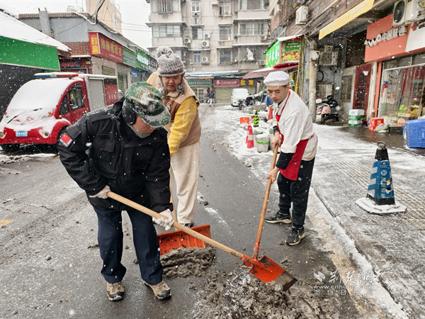 荊楚網(wǎng)(湖北日?qǐng)?bào)網(wǎng))訊(通訊員 熊焱焱)1月20日,武漢迎來(lái)冬日首場(chǎng)降雪,面對(duì)降雪帶來(lái)的道路積雪和結(jié)冰風(fēng)險(xiǎn),糧道街道迅速響應(yīng)、周密部署,組織多方力量晝夜奮戰(zhàn),全力保障轄區(qū)主次干道及背街小巷暢通無(wú)阻,守護(hù)居民出行安全。從撒鹽除冰到全員掃雪,從商戶自發(fā)參與到網(wǎng)格員暖心幫扶,一幕幕守望相助的場(chǎng)景在寒冬中傳遞著溫暖。