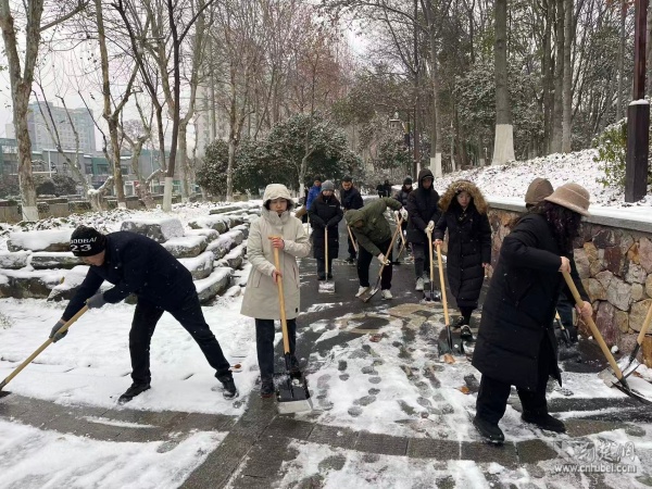 轄區(qū)文明單位積極行動,彰顯社會責任。黃鶴樓公園管理處、辛亥革命博物院領導班子帶隊鏟雪除冰,保障游客安全游覽;武漢大學人民醫(yī)院黨委書記、院長與干部職工一同清掃院區(qū)積雪,確?;颊呔歪t(yī)暢通;武漢市第三醫(yī)院領導干部聯(lián)合武昌區(qū)九三學社三醫(yī)院支社社員開展鏟雪行動,筑牢患者就醫(yī)安全防線;聯(lián)通武昌區(qū)分公司組織清除辦公樓及周邊道路積雪;中國郵政武昌區(qū)分公司各網(wǎng)點員工利用營業(yè)前后時間清掃門前冰雪,鋪設防滑墊、設立提示牌,為客戶開辟“安心通道”;七四三五工廠保衛(wèi)處以“雪停人動、人到雪清”的擔當,組織清掃廠區(qū)大門區(qū)域積雪,筑牢安全防線。