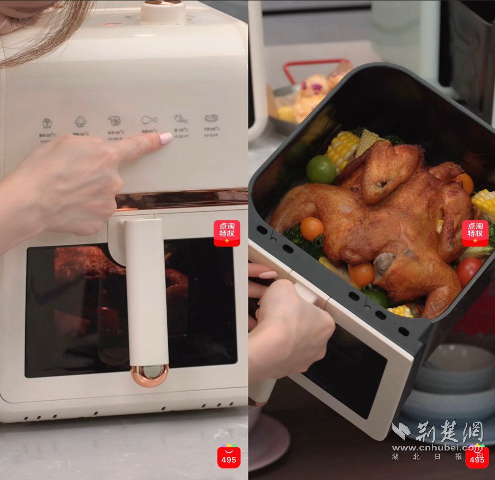 在李佳琦直播間里,觀眾經(jīng)常能看到滿滿一桌由小家電完成的菜肴,“還以為誤點(diǎn)進(jìn)了美食頻道”。主播現(xiàn)場(chǎng)演示用空氣炸鍋15分鐘做出烤紅薯,用蒸煮一體鍋同時(shí)搞定葷菜素菜,用多功能料理機(jī)一鍵蒸魚。