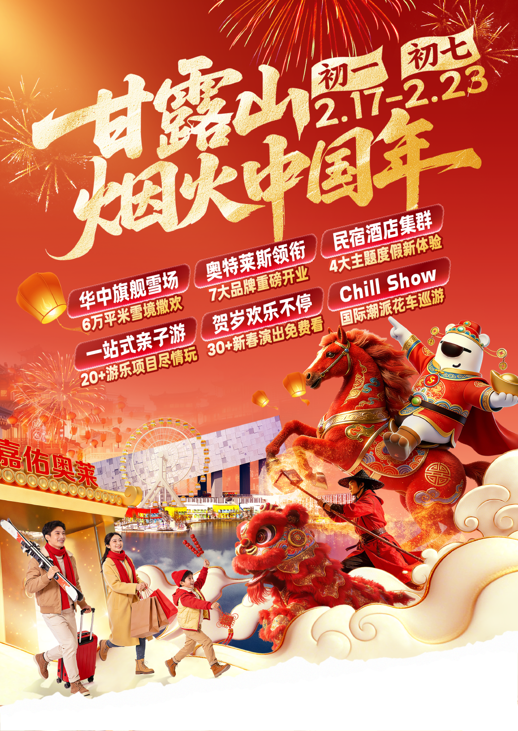 甘露山文創(chuàng)城煙火中國年作為重磅項目,連續(xù)7天呈現(xiàn)水上非遺火龍鋼花、瀑布煙花、光影秀、財神巡游等精彩內(nèi)容,打造集視覺震撼、文化體驗、休閑購物于一體的綜合性節(jié)日度假目的地。