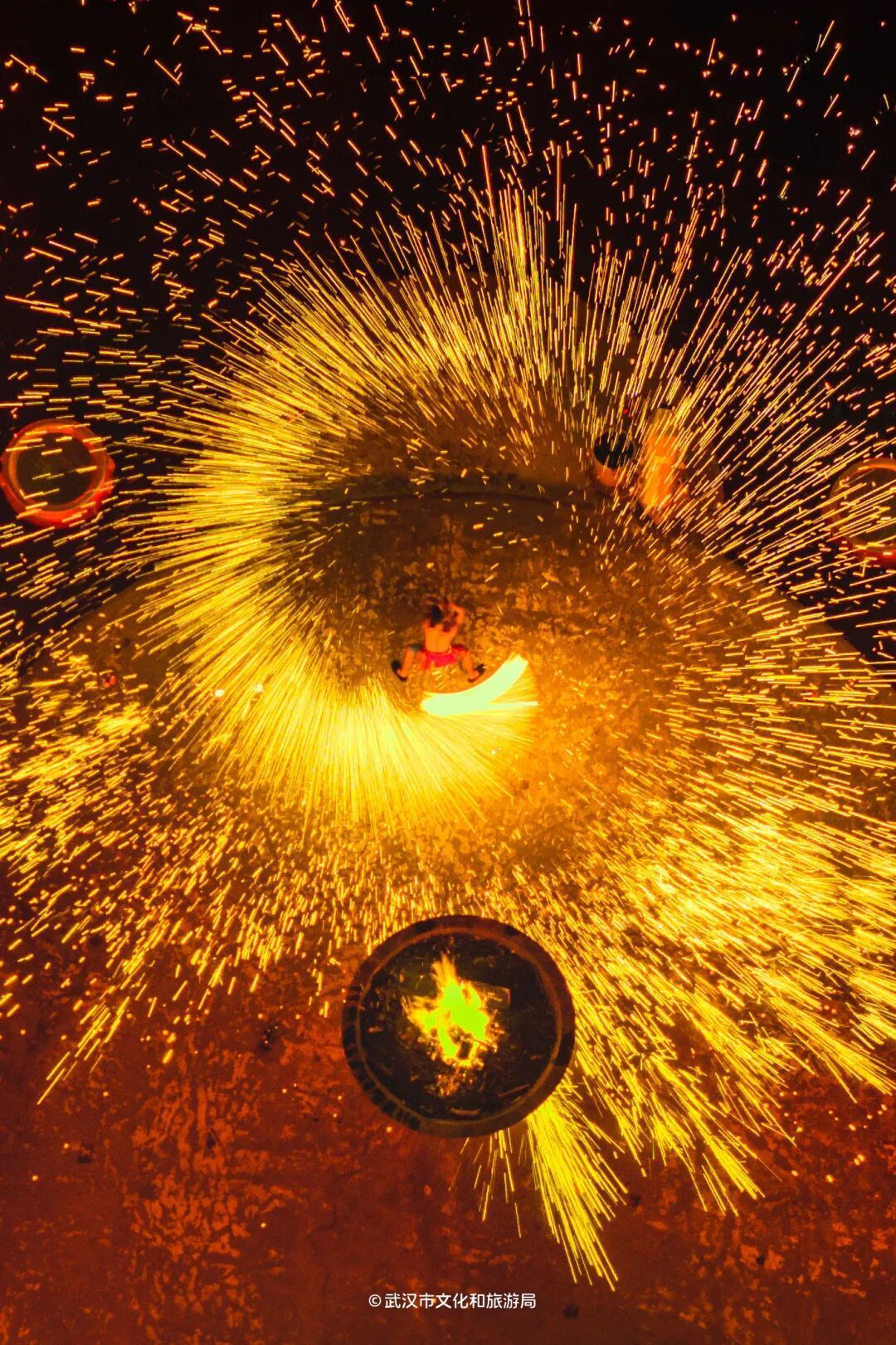 ??木蘭不夜城非遺賀春年以“火”為核心,上演打鐵花、火壺、火刀等震撼視覺的非遺特技演出,點亮夜空,祈愿新年紅紅火火。