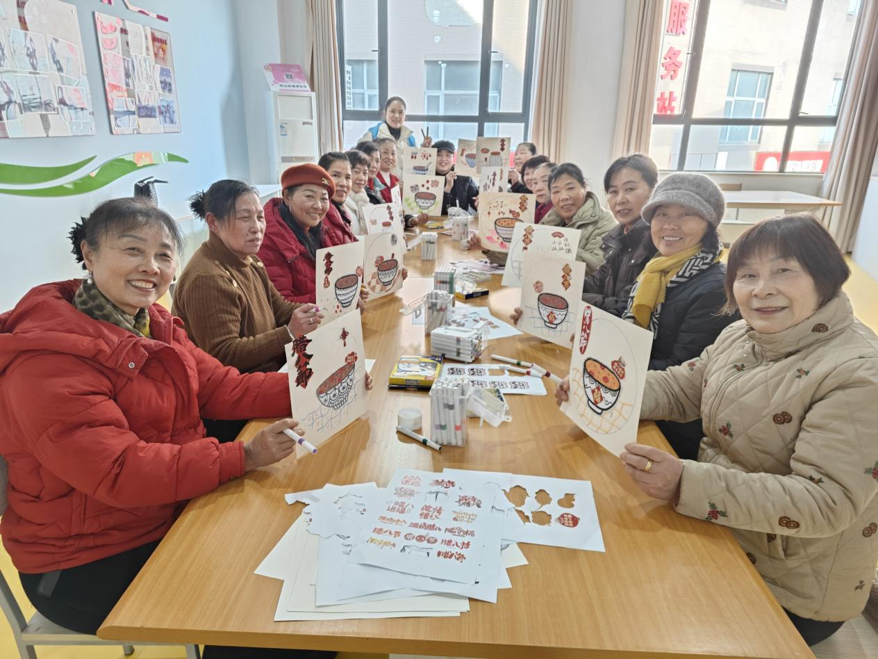 社區(qū)老年人活動中心內(nèi),老人們圍坐在一起體驗(yàn)“溫情臘八”手工繪畫,在創(chuàng)作中增進(jìn)鄰里情誼?!昂枚嗄隂]畫過畫了,今天好像回到了年輕時(shí)候!”74歲的李庭香老人舉著自己剛完成的《臘八團(tuán)圓圖》笑著說道。