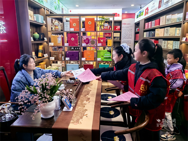 來自樓宇托管班的十余名小學(xué)生,在志愿者引導(dǎo)下化身“小小安全宣傳員”。他們身著“紅背心”,手持禁鞭宣傳折頁和倡議書,分組走進(jìn)陸羽茶都商鋪和人群聚集點,向商戶、顧客及過往市民講解煙花爆竹禁燃禁放的相關(guān)規(guī)定、潛在危害及環(huán)保意義,并分發(fā)倡議資料。