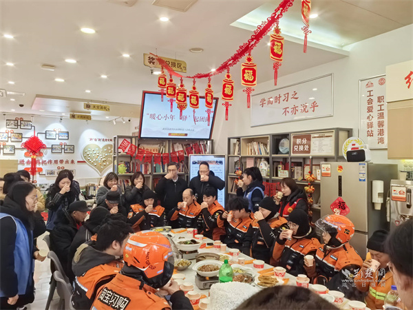 荊楚網(wǎng)(湖北日報(bào)網(wǎng))訊(通訊員 趙坤 童霞)2月10日農(nóng)歷小年,武昌區(qū)南湖街道工會聯(lián)合中央花園社區(qū)、寶安社區(qū)在南湖街新就業(yè)群體服務(wù)工會驛站開展“暖心小年,‘驛’起團(tuán)圓”活動,邀請外賣小哥、快遞員、環(huán)衛(wèi)工人等20余名戶外勞動者歡聚一堂,寫福字、玩游戲、吃團(tuán)圓宴,在歡聲笑語中,感受工會“娘家人”的溫暖。