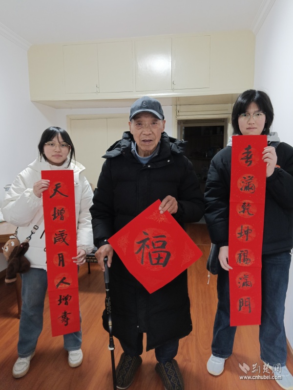 針對(duì)社區(qū)高齡、獨(dú)居老人,志愿者們開(kāi)展“敲門行動(dòng)”,走進(jìn)“鶴耋安”重點(diǎn)關(guān)愛(ài)對(duì)象家中。在88歲的李奶奶家門口,志愿者們將一副寫有“福壽安康”的春聯(lián)認(rèn)真貼好,紅紙金字映亮了老人的笑臉?!澳銈円粊?lái),家里就熱鬧了,這春聯(lián)比買的還暖心!”李奶奶說(shuō)道。每到一戶,志愿者們都送上手寫春聯(lián)與“?!弊?,幫忙排查水電隱患,陪老人聊家常、憶往昔,用陪伴驅(qū)散冬日的冷清。