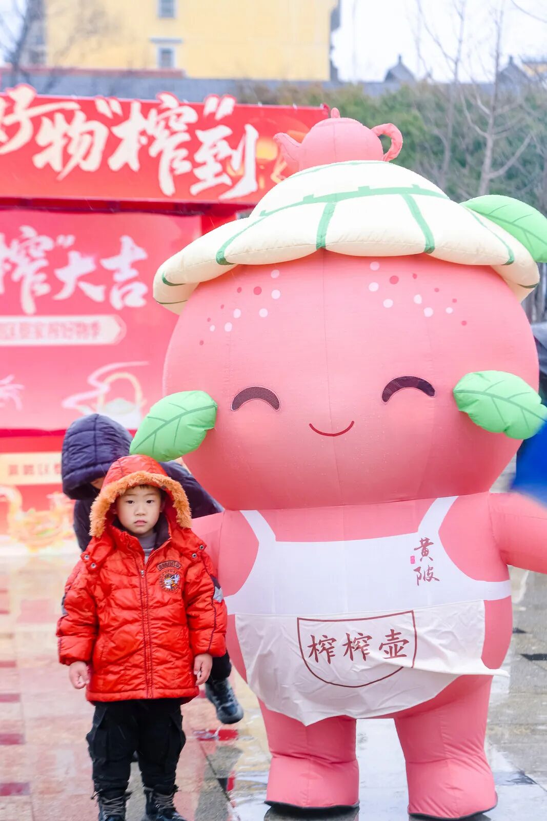 ? 小朋友在活動(dòng)現(xiàn)場(chǎng)與榨榨壺合影。