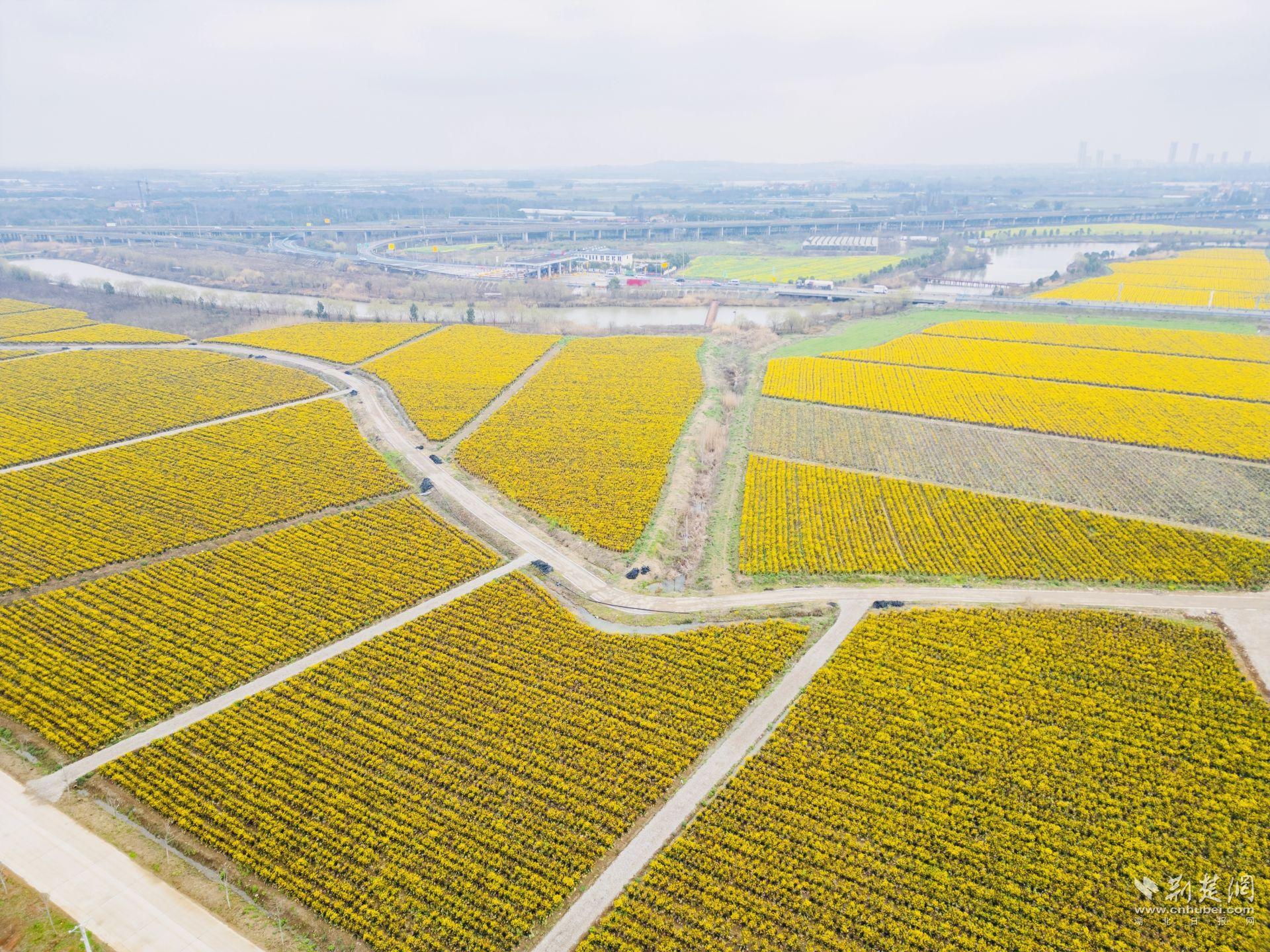 春節(jié)前,基地剛剛完成最后一茬菜薹的采摘,如今卻迎來了生命的“高光時(shí)刻”?;貎?nèi)的洪山菜薹全面盛放,匯成一片金色的海洋。春風(fēng)拂過,花浪翻涌,紫色的菜薹葉與粗壯的菜薹桿在花海中若隱若現(xiàn),形成一幅層次豐富、生機(jī)勃勃的田園畫卷,成為高速路口一道亮麗的風(fēng)景線。