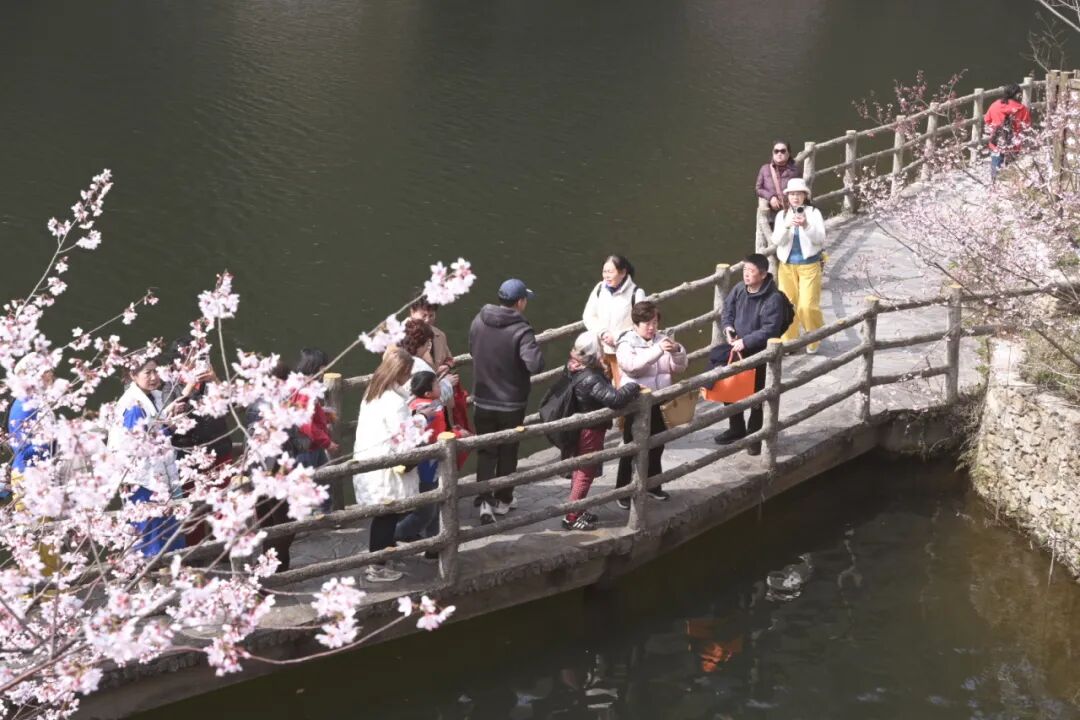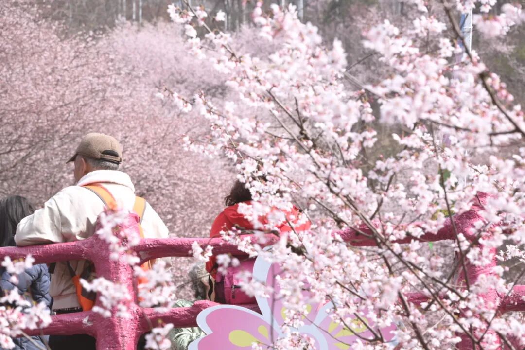 步入景區(qū),綿延道路兩側(cè)櫻花成廊,花枝交錯如云似霞。層層花瓣在陽光下熠熠生輝,粉白相間、隨風輕搖,勾勒出如夢似幻的春日盛景。游客們漫步其間,拍照打卡、駐足欣賞,在山野間沉浸式感受櫻花與春光的雙重浪漫。