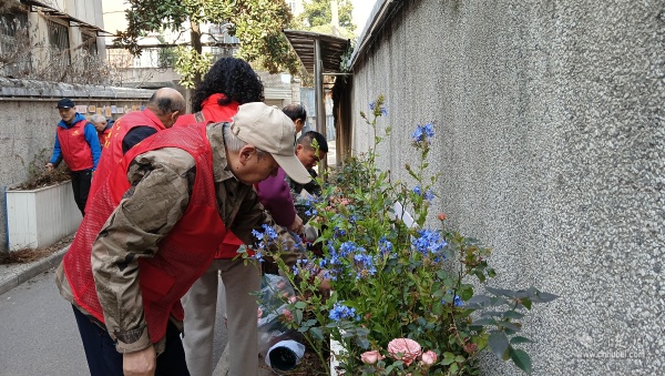 活動當天,50余名參與者分成修剪組、除草組、施肥組、補種組,各組各司其職,協(xié)同作戰(zhàn)。修剪組的成員手持剪刀、鋸子,仔細為綠植清除枯枝和病枝,讓樹形更加規(guī)整舒展;除草組則俯身彎腰,清理綠化帶內(nèi)的雜草雜物;施肥組精準施撒有機肥,為綠植生長注入養(yǎng)分;補種組成員在黃土裸露區(qū)域挖坑、栽苗、培土、澆水,將一株株月季、杜鵑等花卉苗木植入土壤,豐富景觀層次。經(jīng)過一上午的辛勤勞作,先賢街沿線的綠化面貌煥然一新,新補植的月季、杜鵑迎風而立,新翻的泥土氣息與花香交織,為老街增添了盎然生機。