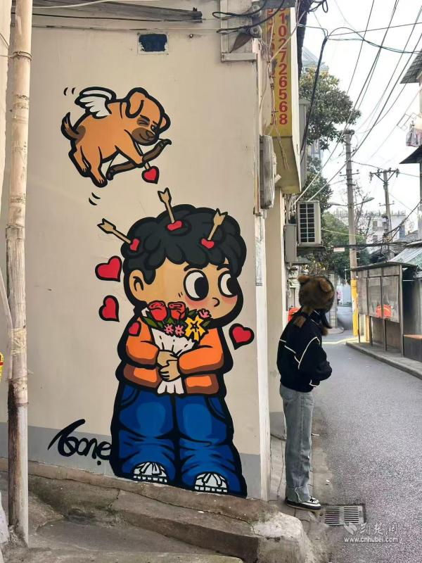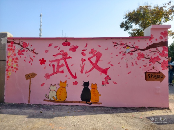 走出彭劉楊路地鐵B2口,來(lái)到社區(qū)八卦井旁,一面粉墻惹人注目,櫻花飛揚(yáng)、四只貓咪相依蹲坐。在社區(qū)攜手武漢學(xué)院藝術(shù)與傳媒學(xué)院青年志愿者開(kāi)展的“墻上生花,美在西廠”主題活動(dòng)中,10余名青年志愿者用畫筆和創(chuàng)意,打造出這面繪有櫻花和貓咪的“武漢”主題墻。