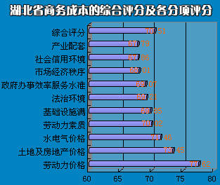 投資者對影響我省商務(wù)成本的十大因素的評(píng)價(jià)都較均衡,各項(xiàng)評(píng)分介于67.8-77之間,綜合評(píng)分70.51,正好位于基本滿意(60)與滿意(80)區(qū)間的中位。較去年同類調(diào)查數(shù)據(jù)相比,提高3.5分。 ……………………………………………………………………