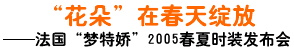 2005年4月5日,源自“時(shí)尚之都”巴黎的經(jīng)典法國時(shí)裝品牌夢特嬌,于春天伊始在武漢香格里拉大飯店上演一場激情四溢的時(shí)尚秀。在夢特嬌春夏時(shí)裝武漢發(fā)布會(huì)上,設(shè)計(jì)師們將經(jīng)典、動(dòng)感和優(yōu)雅融入夢特嬌最新春夏亮絲時(shí)裝系列,將現(xiàn)代經(jīng)典、都市休閑魅力、動(dòng)感動(dòng)力、永恒經(jīng)典和瑰麗高雅五大主題一一呈現(xiàn)。而那最負(fù)盛名的“花朵”標(biāo)志,則仿若今春最絢爛綻放的花朵,在展示臺上奏出一支“春天的圓舞曲”。