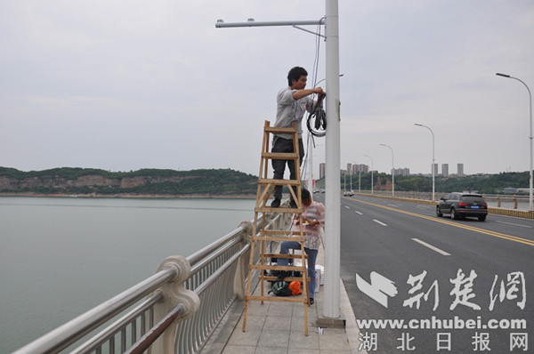 施工人員正在鄖陽(yáng)漢江大橋安裝人臉識(shí)別系統(tǒng),2100米長(zhǎng)的漢江大橋?qū)惭b167套防溺水防輕生監(jiān)控系統(tǒng),并實(shí)現(xiàn)云聯(lián)網(wǎng)。通訊員 王濤 攝