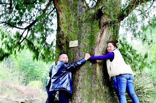 越往山里走,森林越茂密,古樹也越來多。在該村三組的一座老宅后,記者看到一片古樹群。最先映入眼簾的是一棵國家一級柏樹,上面布滿黑褐色紋理,樹干得幾人合圍。不遠處,還有國家二級杉榔、二級柏樹等,整個山坡,就被大大小小幾十棵大樹遮蔽,其中被掛牌保護的就有8棵。“我們村有21個自然村灣,每個灣子都有這樣的原始老林,而且很多都已被掛牌保護,這是村里最大的財富?!贝逯淌烂髡f。他還給記者講了個故事,有一年,一家知名公司的人看上這里的樹,他們愿意出價三萬元,買走其中一棵,但村民們毫不心動,當(dāng)場就給拒絕了!