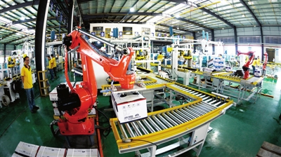 4月29日,通城縣通成高新材料有限公司運用自動機械手臂進(jìn)行生產(chǎn)。