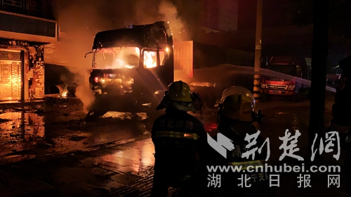 圖為消防指戰(zhàn)員撲滅貨車火災(zāi)現(xiàn)場(chǎng)。 肖幫治攝