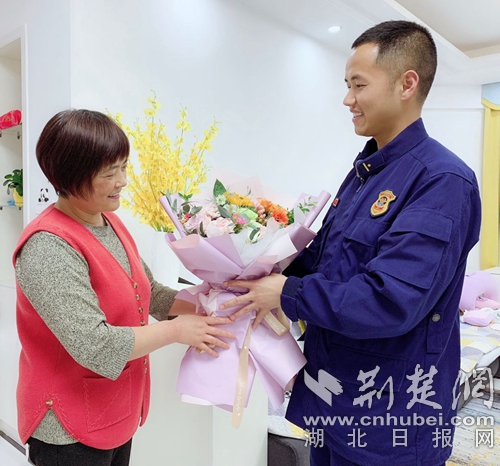 圖為消防指戰(zhàn)員親手送鮮花給母親。 劉太鋼攝