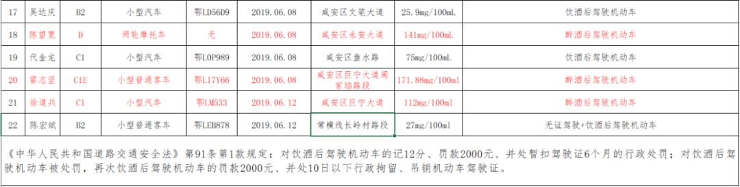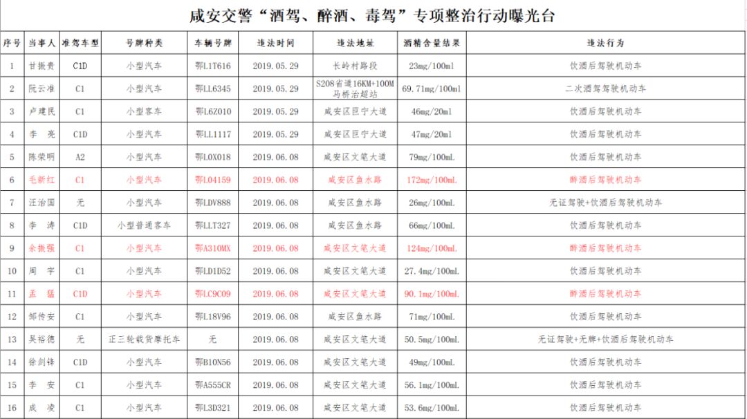 咸安公安分局交警大隊(duì)對酒駕醉駕持續(xù)保持高壓嚴(yán)管“零容忍”態(tài)勢,同時對近半個月(5月29日——6月13日)以來的酒駕醉駕駕駛?cè)诉M(jìn)行實(shí)名曝光。