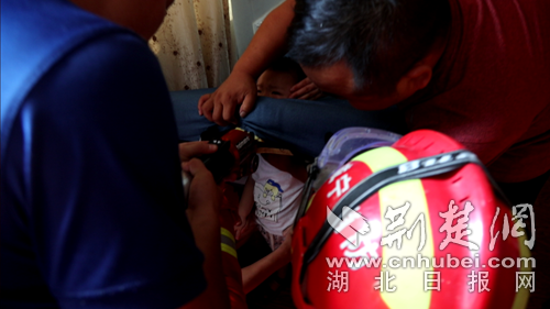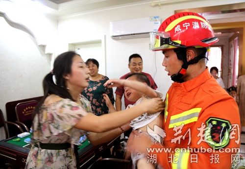 圖為消防員救出小孩現(xiàn)場。 朱濤攝