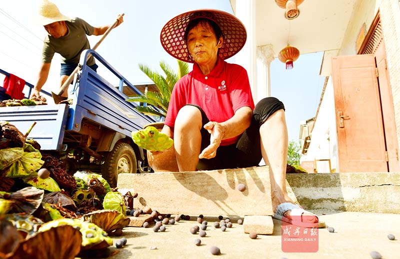 “現(xiàn)在每天5點(diǎn)半就下田,天太熱,一般采到9點(diǎn)多收工,怕中暑?!眲⑺既河靡滦洳亮艘话押顾榻B,夏天是蓮子的高產(chǎn)季,村里大概有60多戶種湘蓮,每天100多人在田里勞作。