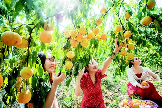 8月7日,嘉魚縣新街鎮(zhèn)嘉多寶果蔬、世外萄園的果園里碩果累累,游客體驗(yàn)著采摘的快樂。近年來,嘉魚縣新街鎮(zhèn)在351國道沿線建設(shè)“十里花果長廊”,大力發(fā)展農(nóng)旅融合經(jīng)濟(jì)。(湖北日報(bào)全媒記者陳勇通訊員耿海軍馬映攝)