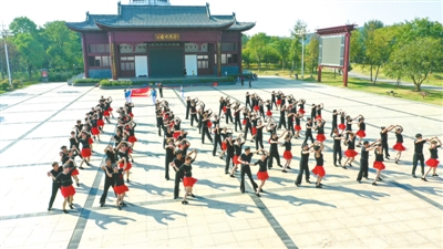 9月8日,在嘉魚二喬公園,嘉魚交誼舞團隊100多名舞者,正在錄制嘉魚交誼舞團隊與軍運會同行《兵兵三步踩》,該視頻將在武漢軍運會期間播放。