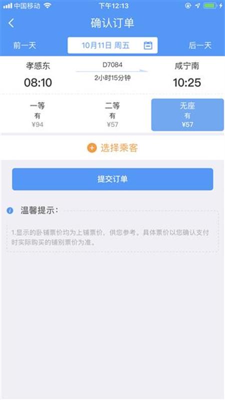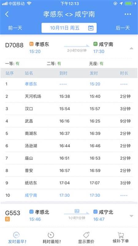 17時09分從咸寧南始發(fā),沿途??肯虒帠|、橫溝橋東、山坡東、紙坊東、廟山、湯遜湖、南湖東、武昌、漢口、天河機場等站,20時11分終到孝感東站。