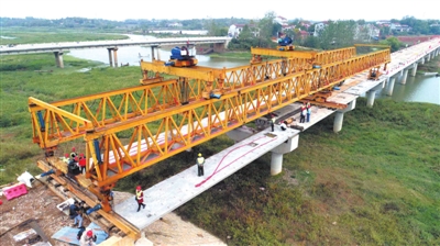 10月15日,咸安區(qū)淦河流域官埠窯咀大橋工地上,工人們正在吊裝最后一片箱梁,這也標志著該座大橋正式合龍。