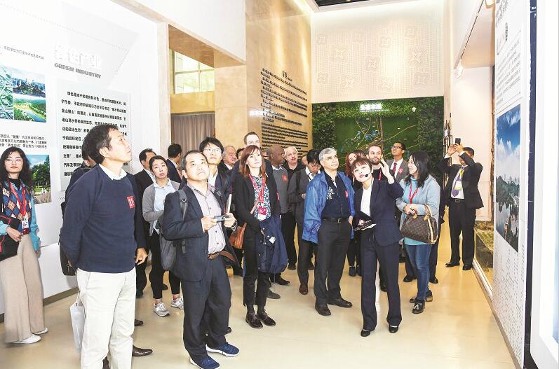 圖為:2019年10月16日,與會的中外專家學者參觀咸寧城市規(guī)劃館。