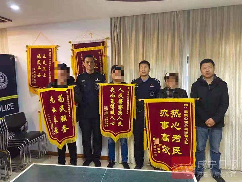 咸寧網(wǎng)訊(香城都市報記者 方達星 通訊員 胡微) 11月18日上午,山東騰州的楊先生、浙江上虞的倪女士以及江西上饒的張先生三人,將三面錦旗送到溫泉巡特警手中。他們連連道謝,感激之情溢于言表。