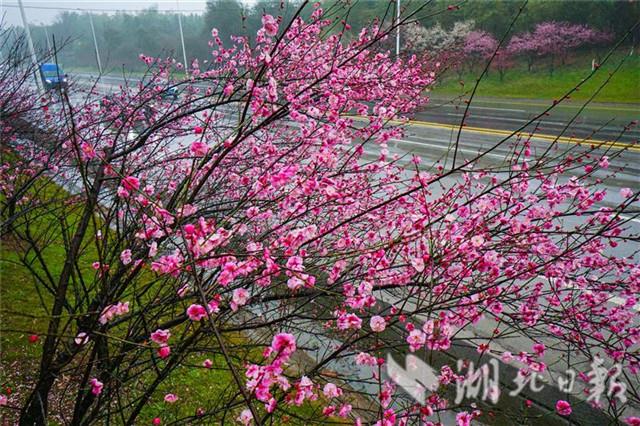 2月13日,咸寧市咸安區(qū)桂鄉(xiāng)大道兩旁的紅梅花在風(fēng)雨中含笑迎賓。