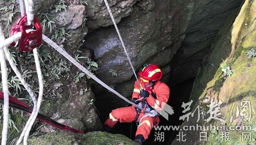 因消防車無法抵達,消防員帶上救援工具,徒步半個多小時迅速趕赴事發(fā)現(xiàn)場開展救援。到達現(xiàn)場后,發(fā)現(xiàn)一名三十多歲男性在一個10多米的深洞內(nèi)呼救。經(jīng)與被困者和現(xiàn)場群眾溝通了解,此洞名為藏龍洞,是一個未經(jīng)商業(yè)開發(fā)的深洞,有著悠久的歷史傳說,引來無數(shù)探險者,這名男子也是因為好奇,下洞后體力不支無法再攀爬出洞被困洞底。中隊指揮員根據(jù)現(xiàn)場情況,立即利用救援繩索做好安全支點,消防員何聰點降至洞底查看被困者情況,所幸洞內(nèi)空氣流暢,被困者無二次受傷的危險,消防員利用隨身攜帶的全身吊帶將被困者固定好后,經(jīng)洞外消防員齊力,最終經(jīng)過20多分鐘的救援,被困人員被成功營救出山洞。