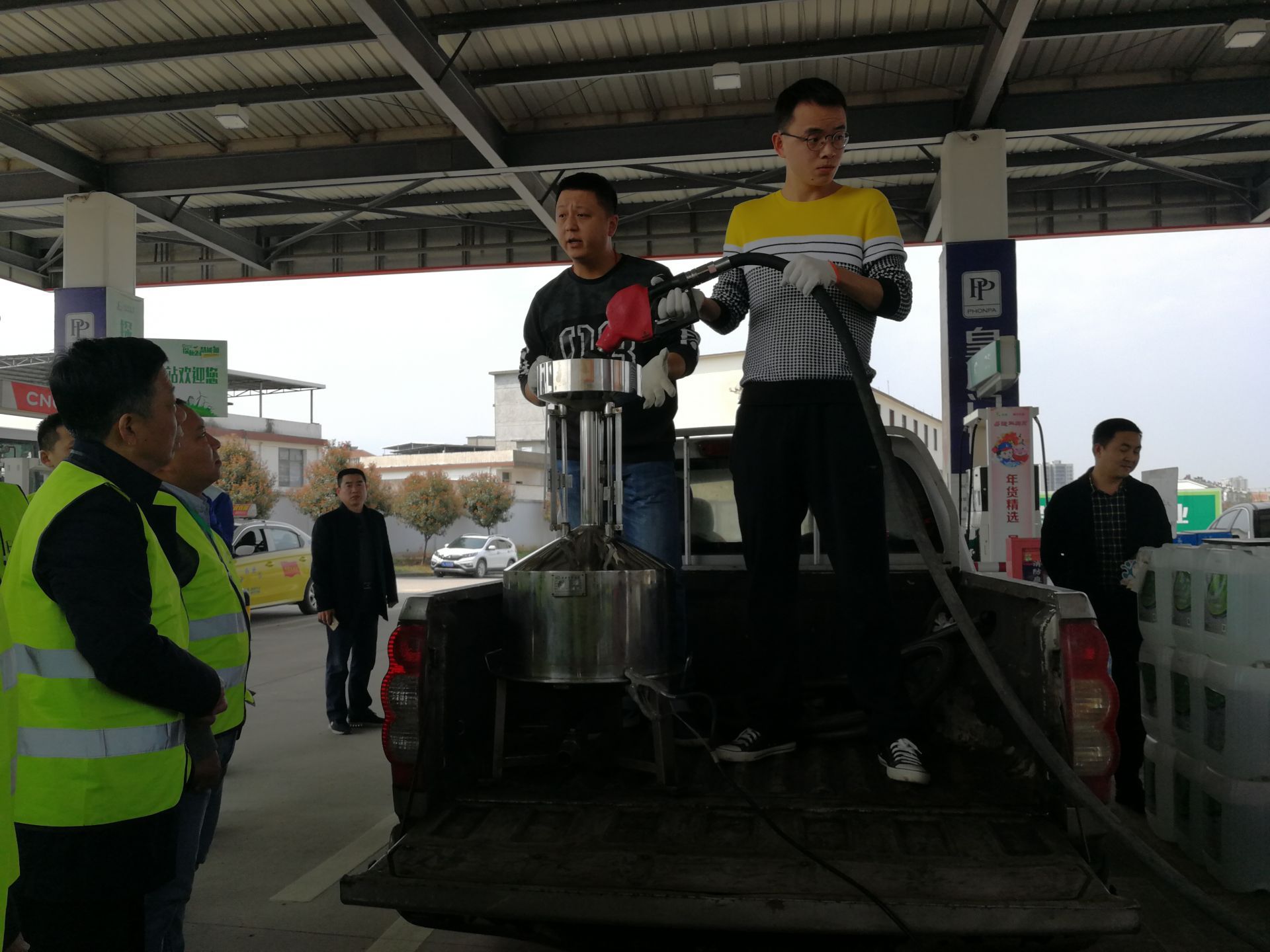 圖:咸寧市質(zhì)監(jiān)部門(mén)正在對(duì)賀泉加油站的加油裝置進(jìn)行檢測(cè)。