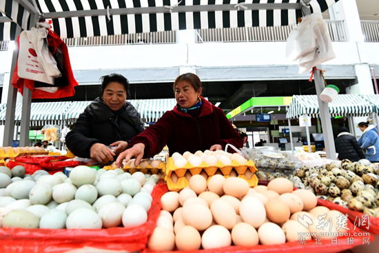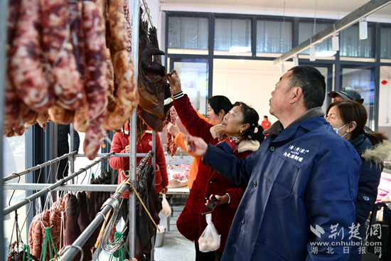 在肉類攤位前,剁了20多年肉砧板的胡金山割肉的手麻利多了——他邊賣肉,邊招呼顧客,今天喜遷新市場,瞧這秤也足足的。排著長隊(duì)購買“兩頭烏”豬肉的顧客不時(shí)盯著屏幕上中央電視臺拍攝采訪這位養(yǎng)豬大戶的專題片,有的掃一掃二維碼,看養(yǎng)豬場實(shí)況。